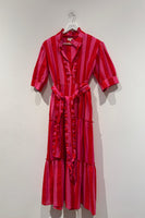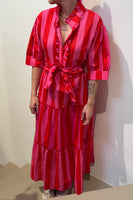 Crafted in soft, breathable cotton, this striking dress blends comfort with effortless elegance. Featuring bold red and pink stripes, delicate ruffle detailing along the neckline, and a flattering belted waist, it’s designed to move with you from day to night. The flowing tiered skirt adds a touch of playful femininity, while the half-sleeves give it a timeless silhouette.