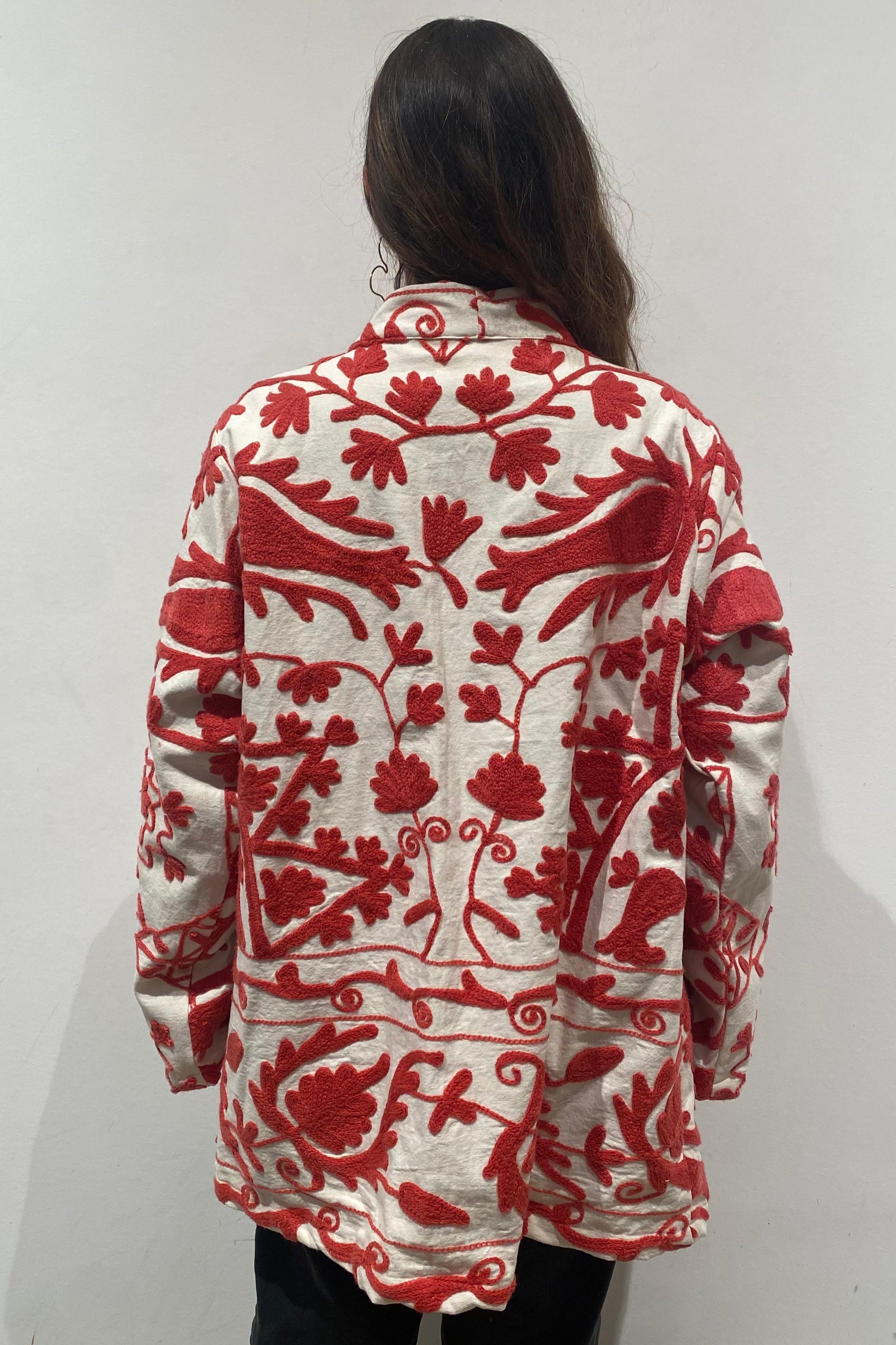 Designed in a one-size silhouette, it offers a comfortable, relaxed fit that drapes beautifully on different body types. The intricate floral embroidery and striking motifs bring expressive character to the garment, making it a standout layering piece for any wardrobe.
