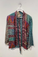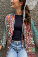 Get two kimonos in one! Our Babou reversible kimono is up-cycled from vintage sarees (a traditional Indian silk cloth). The long loose fit makes it the perfect piece to wear on any occasion, to add a splash of color and feel comfortable as well. Style it with a black or white top or over your bikini in summer and a warm high neck in winter. This unique item is handmade by the saree-suppliers Vimla, Kamla, and Babou who run a small family business in Northern India.