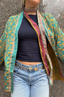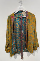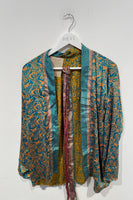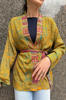 Get two kimonos in one! Our Babou reversible kimono is up-cycled from vintage sarees (a traditional Indian silk cloth). The long loose fit makes it the perfect piece to wear on any occasion, to add a splash of color and feel comfortable as well. Style it with a black or white top or over your bikini in summer and a warm high neck in winter. This unique item is handmade by the saree-suppliers Vimla, Kamla, and Babou who run a small family business in Northern India.