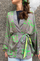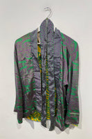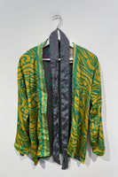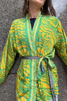 Get two kimonos in one! Our Babou reversible kimono is up-cycled from vintage sarees (a traditional Indian silk cloth). The long loose fit makes it the perfect piece to wear on any occasion, to add a splash of color and feel comfortable as well. Style it with a black or white top or over your bikini in summer and a warm high neck in winter. This unique item is handmade by the saree-suppliers Vimla, Kamla, and Babou who run a small family business in Northern India.