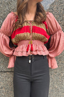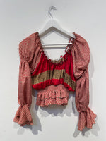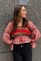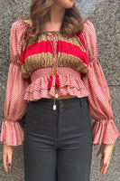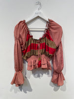 This top features a bohemian-inspired silhouette with voluminous sleeves, a smocked waistline, and a flattering peplum hem. The neckline can be worn on or off the shoulders, and is adorned with decorative ties and tassels. Made from upcycled saris, each piece is completely unique, making it both sustainable and versatile.